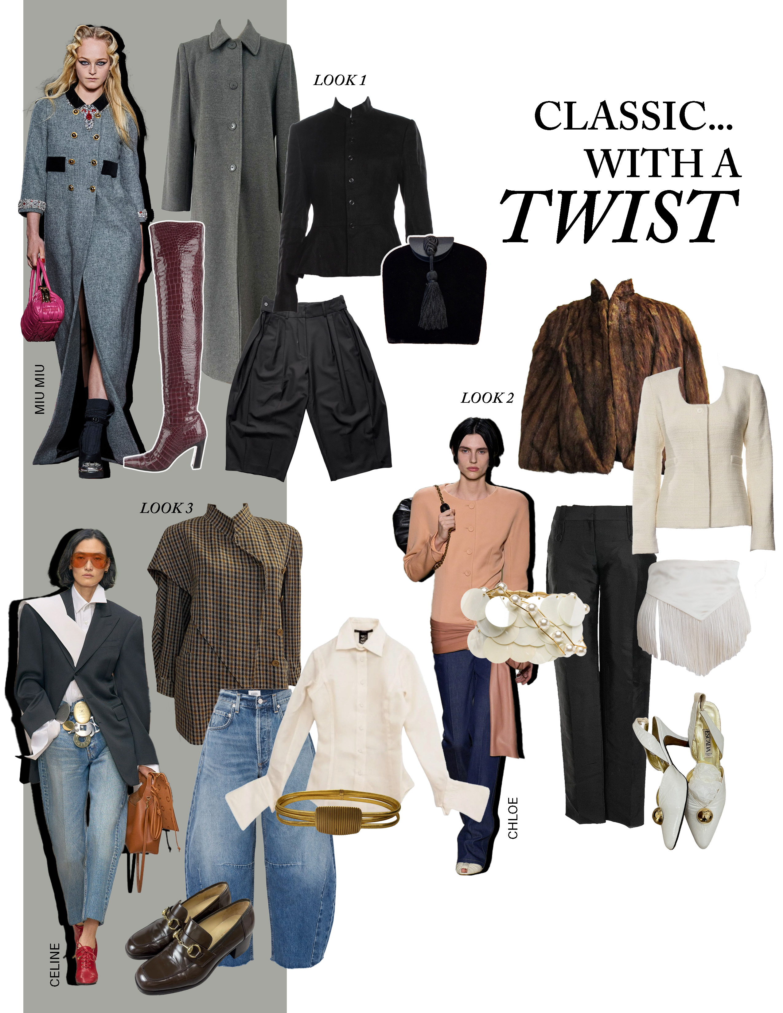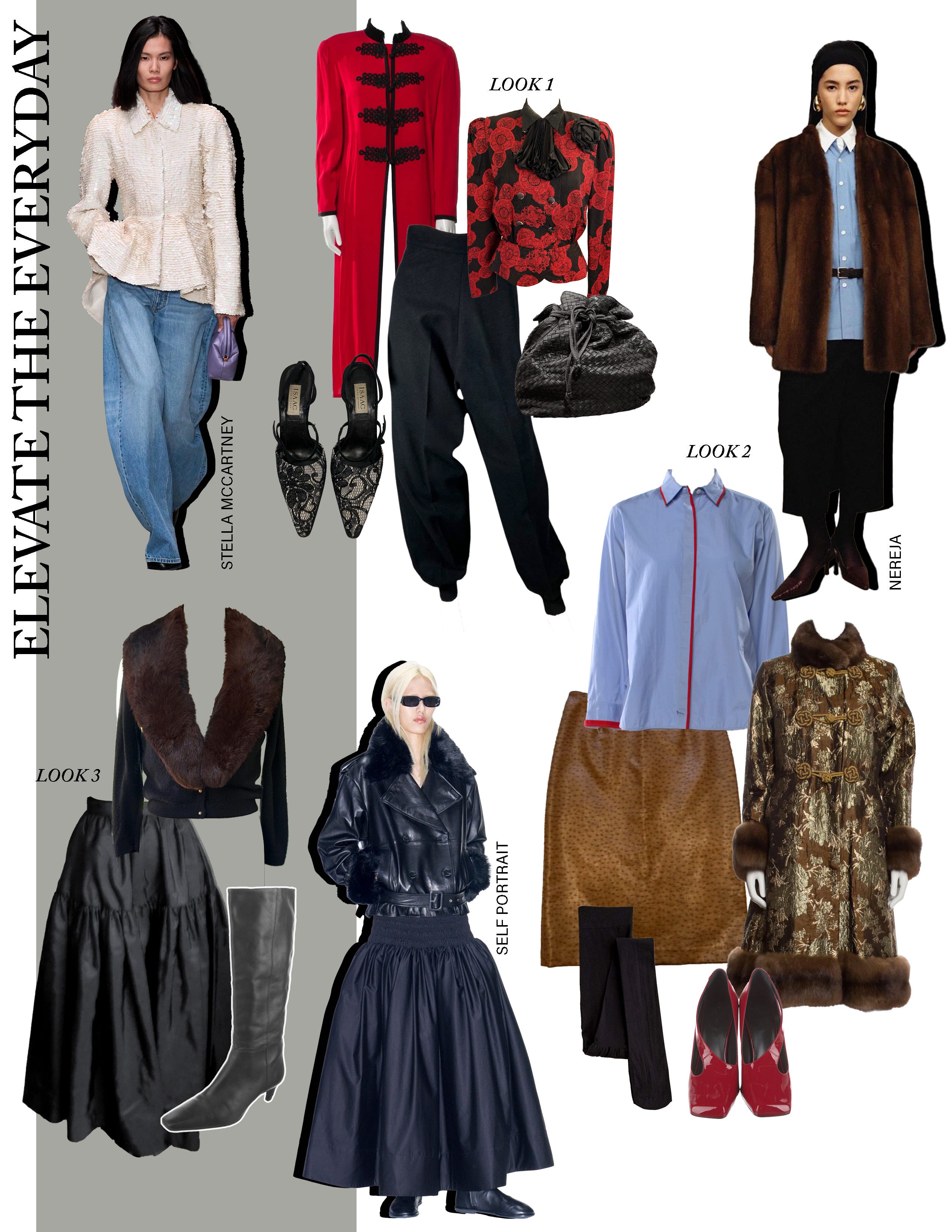 Look 1: Vintage Richard Warren evening jacket, $38.99 (shop on eBay); Vintage Bill Blass coat, $228; Vintage balloon wool pants, $87.50 (shop on eBay); Vintage Isaac Mizrahi lace heels, $55 (shop on eBay); Bottega Intrecciato bucket bag, $499 (shop on eBay)