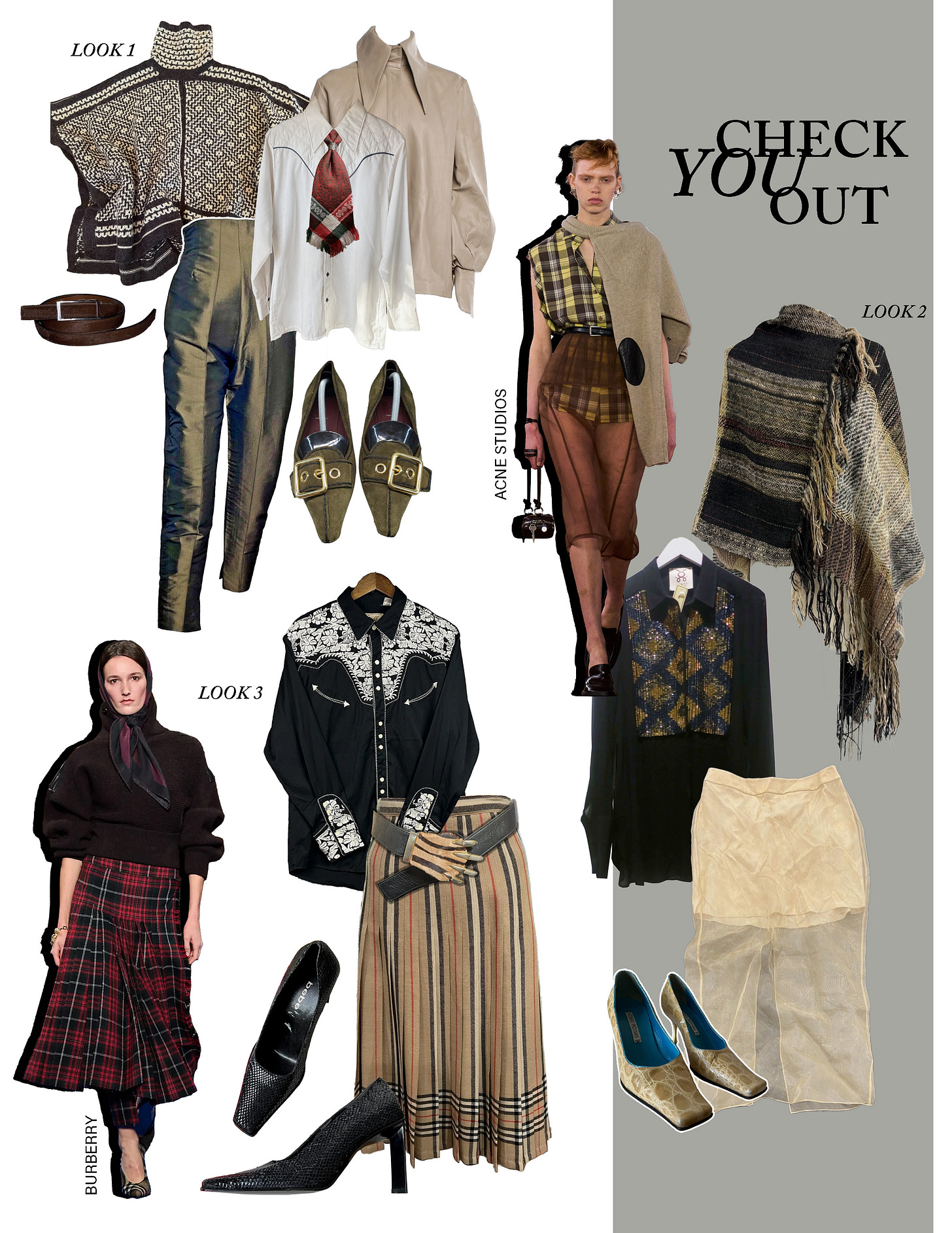Look 1: Vintage 70s western button down, $85; 16Arlington leather button down, $308; Vintage silk plaid tie, $25; Ralph Lauren poncho, $49.99; Romoe Gigli toreador pants, $621; Prada suede kitten heel, $79; Cole Haan calf hair belt, $24.95 (shop all on eBay)