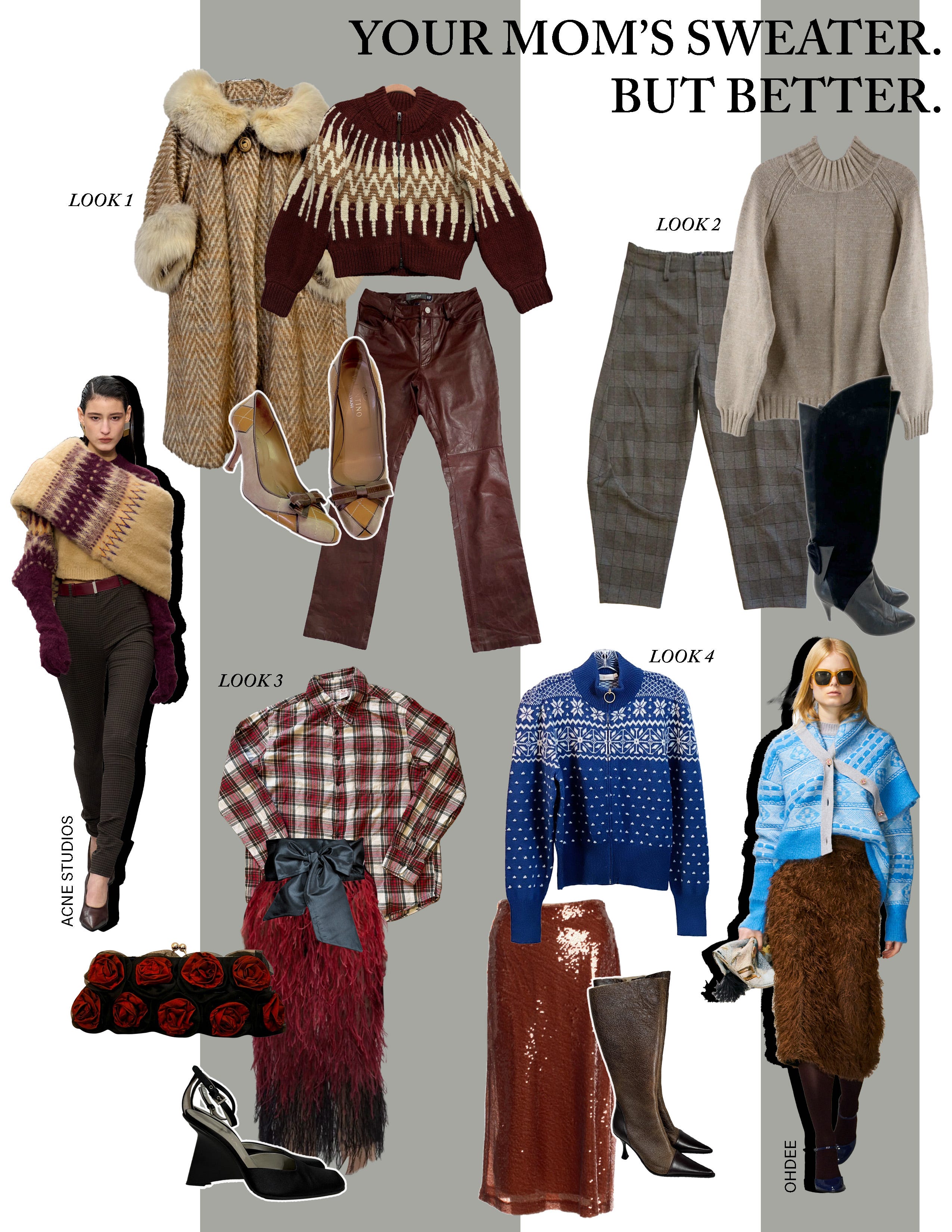 Now let’s pivot. Fair isle is the sweater of the season. But a sweater alone would be boring. We like to stay on our toes. So, up the tension and move to 2nd position. (There is a slightly unnecessary DJ-ified song playing in the background to keep us on beat.) We are upping the challenge. This isn’t your mom’s sweater. Well, it might be, but it’s not your mom’s styling. We are leaning into texture. We are leaning into color combinations. We are mixing high & low, workwear and luxury, casual-wear and evening. Don’t worry, you can do it. Please refer to the below templates for guidance. And don’t be afraid to play with styling - tuck your pants into knee high boots. Jodhpurs are chic. (Looking at you, look 2.) Tuck your grandpa’s flannel into a feather skirt. (I was given one shirt when my grandfather died, and I guarantee you he never thought his flannel would be paired with a vintage beaded fringe shawl and stiletto boots.) Match your grandma’s 50s swing coat to a pair of 90s leather pants. The world is your oyster, and we are climbing the hill. (Still in 2nd position.)