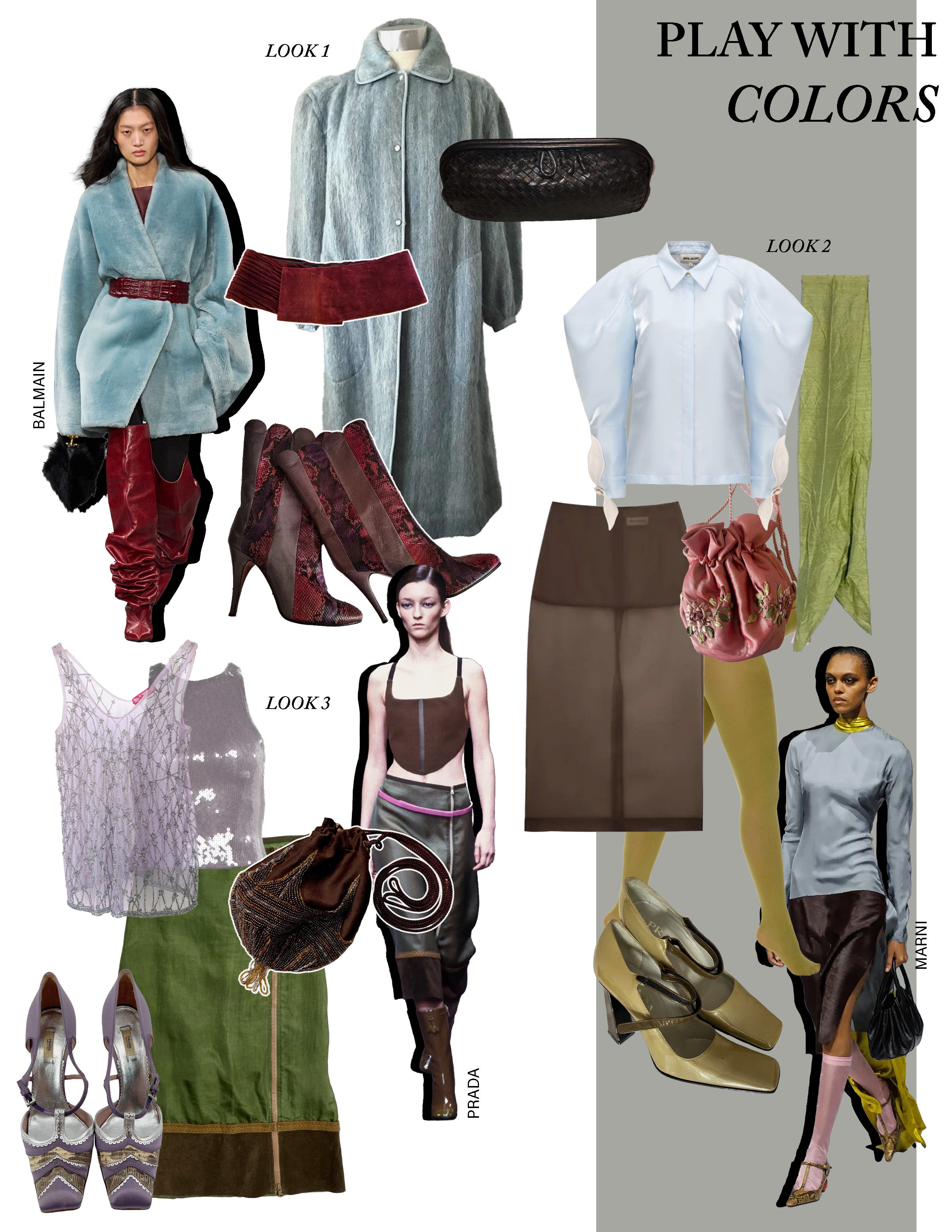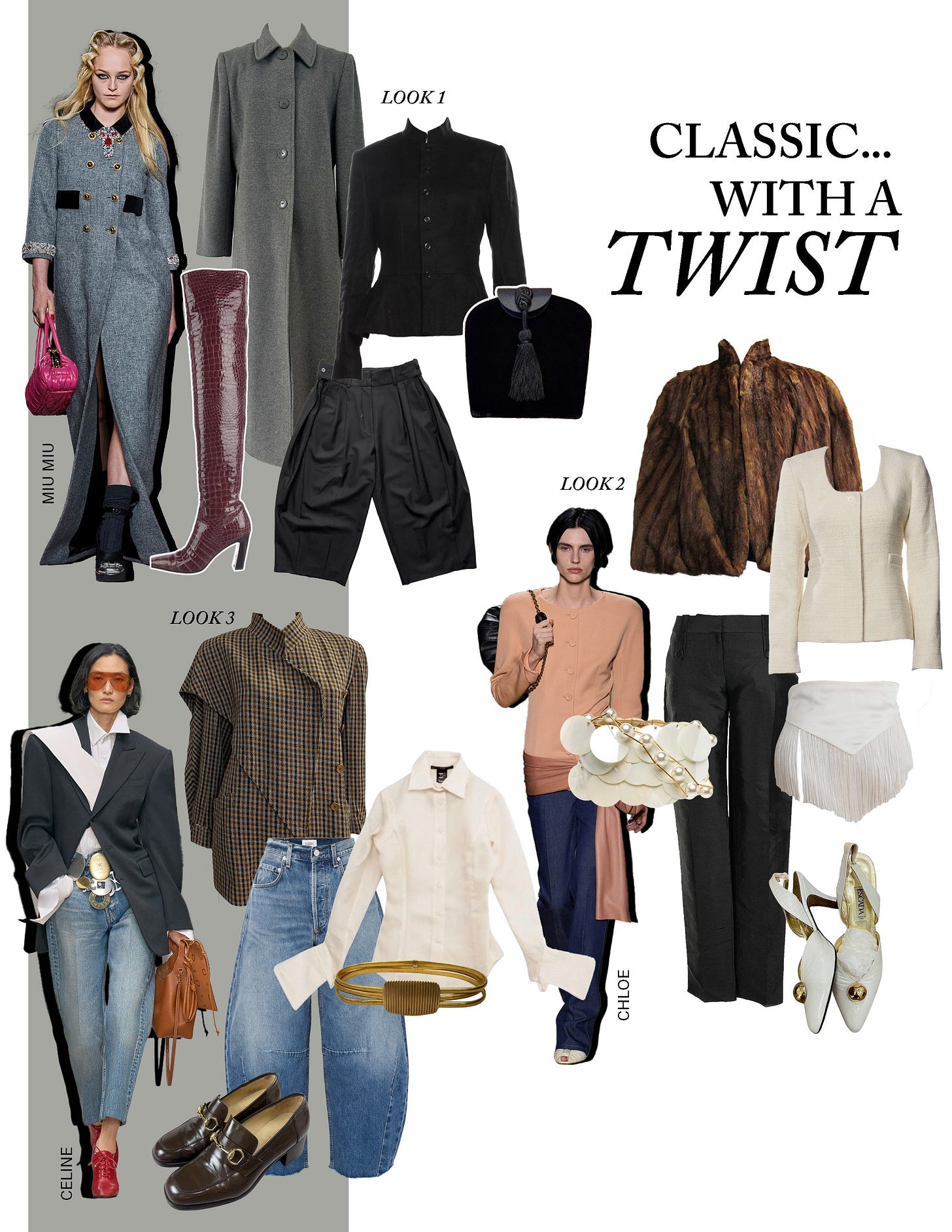 Look 1: Ralph Lauren Purple Label jacket, $177; Balenciaga Vintage Fall 2004 parachute shorts, $850 (shop on eBay); Tassel envelope bag, $27.67 (shop on eBay); Larry Levine duster coat, $79.95 (shop on eBay); Khaite OTK embossed leather boots, $1,775 (Plus a great vintage Escada coat alt if you prefer satin)