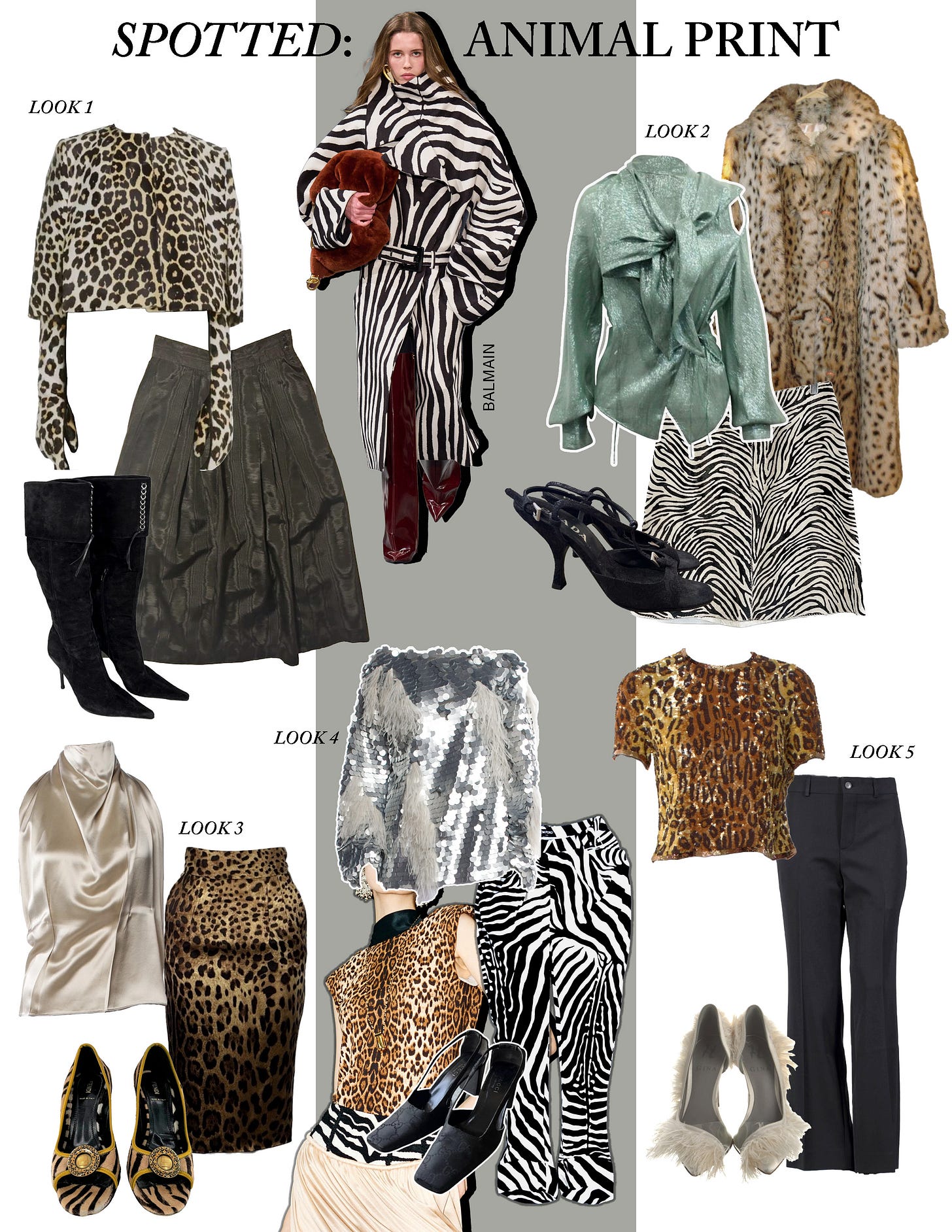 Look 3: 16Arlington silk cowl blouse, $220.50; Vintage Dolce & Gabbana leopard skirt, $240; Vintage Fendi zebra heels, $179.95