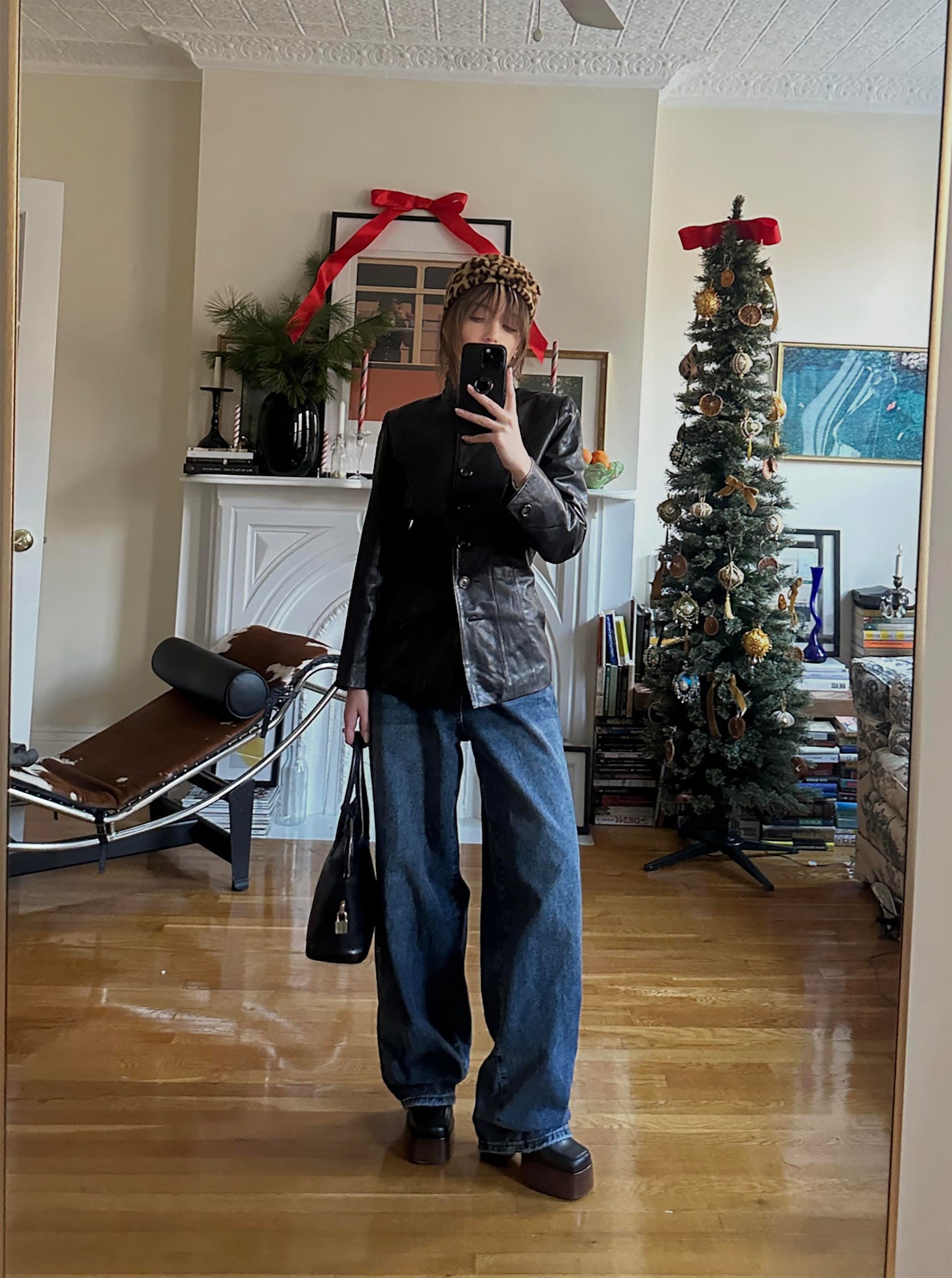 This, while a simple enough look, may be one of my greatest successes to date. I had this Givenchy jacket saved on my eBay watchlist for probably a year. No joke. I was going to treat myself one day, and then one day came, and tariffs had been put into place. And this jacket was coming from Japan. So, I left it in my watchlist, hoping that one day this hurdle to my dream would simply go away. To no avail, international trade wars stop for no eBay aficionados. And then, one day, after checking in on this supple leather delight, it was sold. I had a brief mourning period, like seven seconds, and moved on with my day. We were simply not meant to be. And then, maybe because I had been a good sport about it all, the universe turned in my favor. Blue Greene posted in a Substack chat that she was selling said jacket. I, not one to typically read all my Substack notifications with immediate urgency, slid into those DMs with the exigency and level of speed typically reserved for F1 racetracks and children running up basement stairs after turning off the lights. I would not miss out on this opportunity again. And so, with my fur coat on and Moon Boots laced up, I braved the first snow of the season, hauled myself down to Soho, and acquired my dream. (Everyone say thank you, Blue Greene.) I wanted to let the jacket speak for itself - I kept the rest of the look cool, calm, and casual (if you consider 7” platforms casual). The Solmar jeans make a repeat appearance (these aren’t the exact pair, but I like this option) - and as a 5’1” gal, I needed a bit of extra height. Enter, the loafers. I don’t think they sell this exact style anymore, but this is a pretty good alt. And I kept the accessories minimal - my saffiano leather top handle bag and my leopard pillbox hat. I wrote about both of them below, for anyone interested.