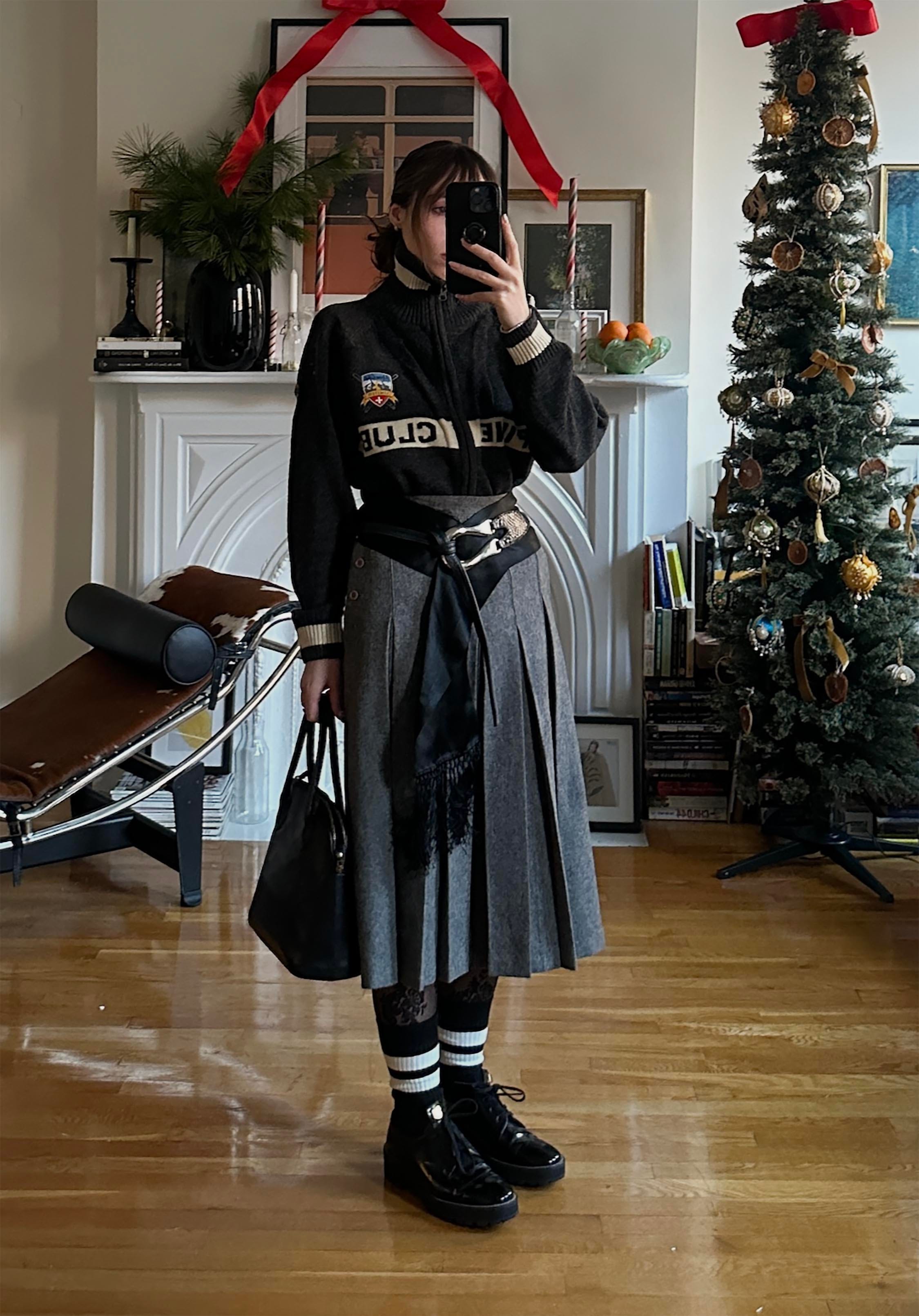 This outfit is more in line with my traditional grey styling - grey on grey on black on white on grey on black. Ya know? This sweater is an old acquisition - I have no idea where or when I got it. (Here is the exact option, a great alt here (shop on eBay), and I’m kind of in love with this option.) But I liked the sporty undertones paired with the crisp tailoring of the skirt. And then to make the horizontal stripe feel intentional, I added some sporty striped socks. Again, I don’t remember where I got these. I wanted a chunky sole, but wasn’t feeling my lug sole Prada loafers. I then remembered my Stuart Weitzman Jesper oxfords. I have had these tucked into my shoe rack for years - I bought about seven pairs for my senior year runway show, and they are still in my mom’s basement. (She keeps reminding me. If anyone wants a pair, I have many.) These shoes felt more elevated than the chunky Prada loafers. And I finished it off with the same leather bag.