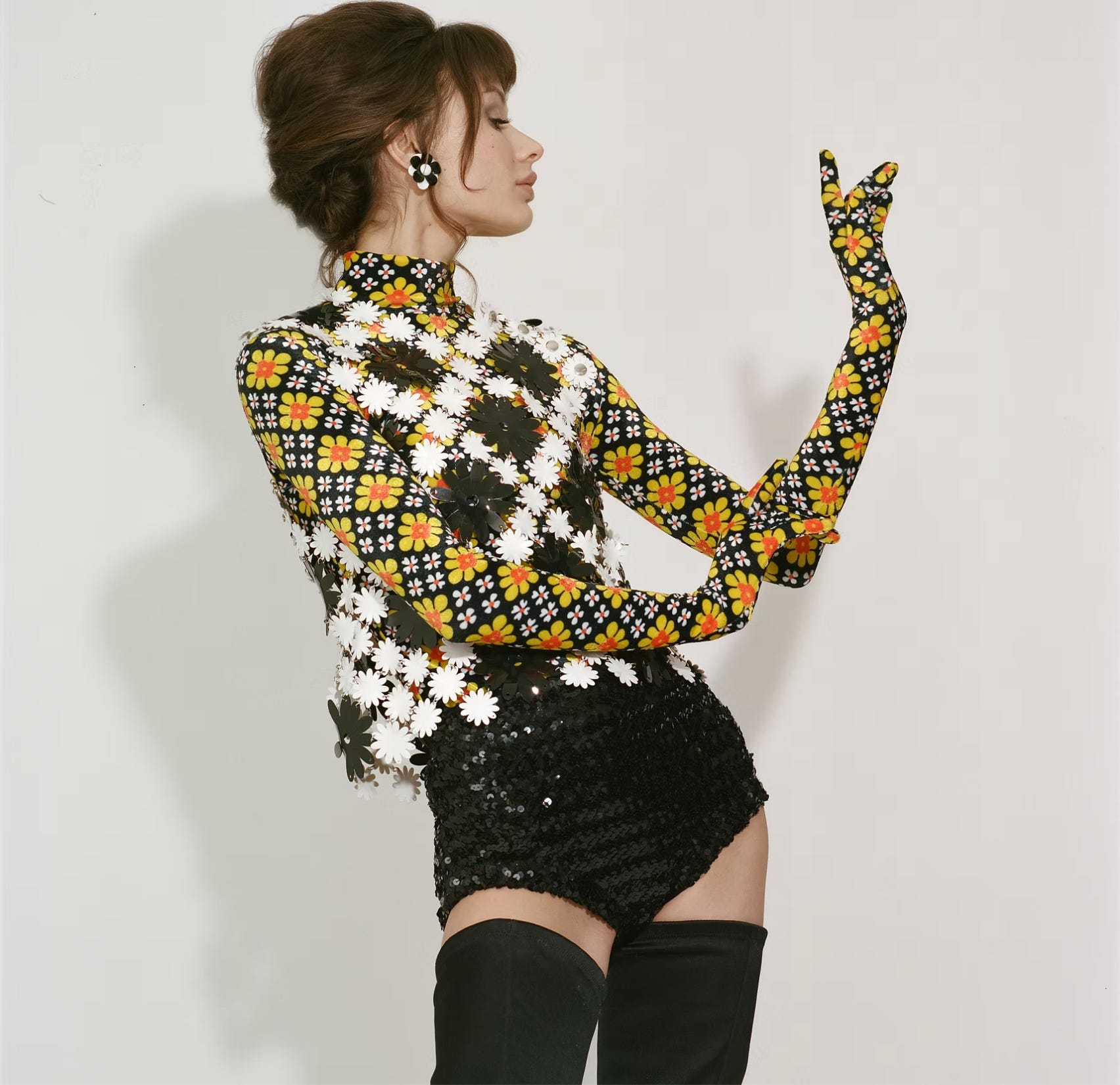This is looking like it will be my New Year’s Eve outfit. Nothing says Lower East Side bar like hot pants and a barely-there shirt. I just bought this top from Consignment Brooklyn. (Writing this post has made me realize that I need to be stopped. Budgeting will be so in for me in 2026.) But shirts, specifically of the warmer weather variety, are something I lack. So I feel justified in this purchase. I’m starting to think this Substack might just be a place for me to defend my poor money-management skills. But that’s a discussion for another day. I didn’t want to go with plain black tights, and I didn’t want to go with pants either. I just bought (again, help!) these Calzedonia tights (this was justified, they were for a shoot). And, although hard to see, I put on my sequin booty shorts. I am 100% sure these are a circus costume given the fact that they came with matching fingerless opera-length sleeves. May I propose these shorts if anyone is interested? And these gloves?