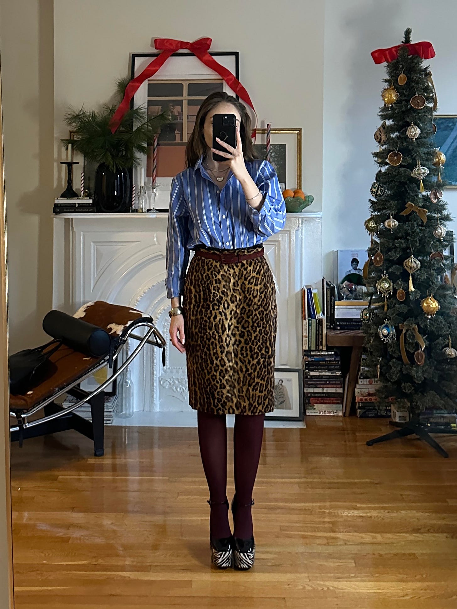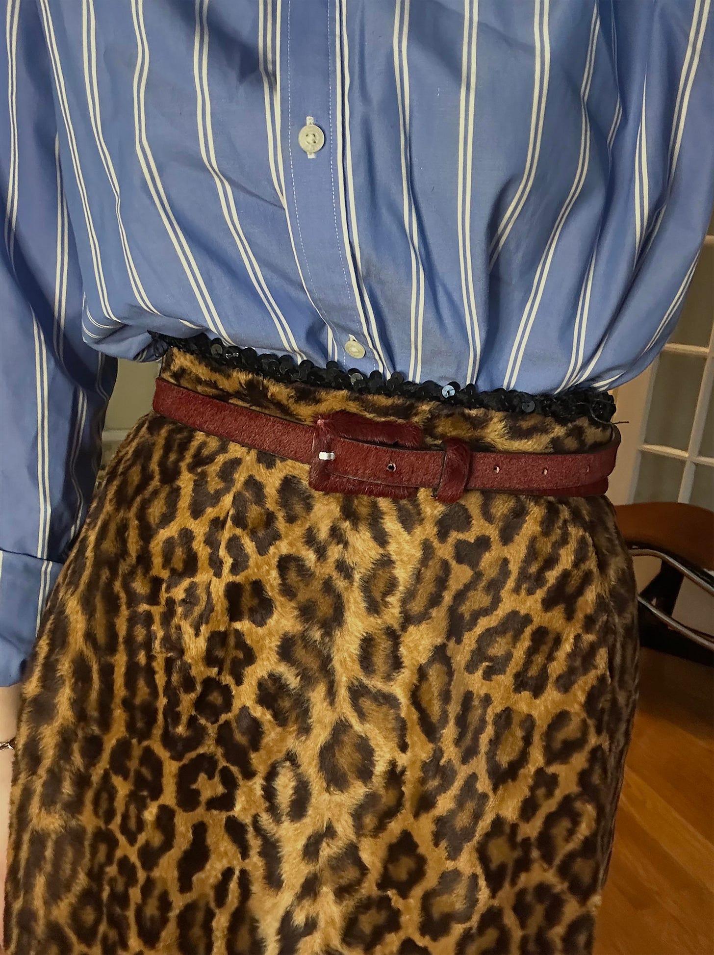I’ve been loving cornflower blue and maroon at the moment (original, I know), so I started with these Calzedonia tights. And, as luck would have it, I happen to have a calf hair belt in the exact same shade of red. So, on that went. I still wanted a little extra detail at the waist, so I let the very top of my sequin shorts peek above the skirt. Still not sure if it works, but I had fun, and that’s what matters. To keep the look from getting too out of hand, I threw on my favorite button down - a striped Chaps shirt from Goodwill. I love this one and this one (shop on eBay). All the blues and reds were accounted for, but I still needed shoes. I needed to bring the white back into the look somehow, and like I always say, animal prints are a neutral. So, I slipped on my Guiseppe Zanotti zebra platform heels. This is the exact pair (shop on eBay), but I also love these, these, and these (shop on eBay). I think there is enough going on that the random combination of pieces actually makes sense. Kind of an in for a penny, in for a pound mentality on this one.
