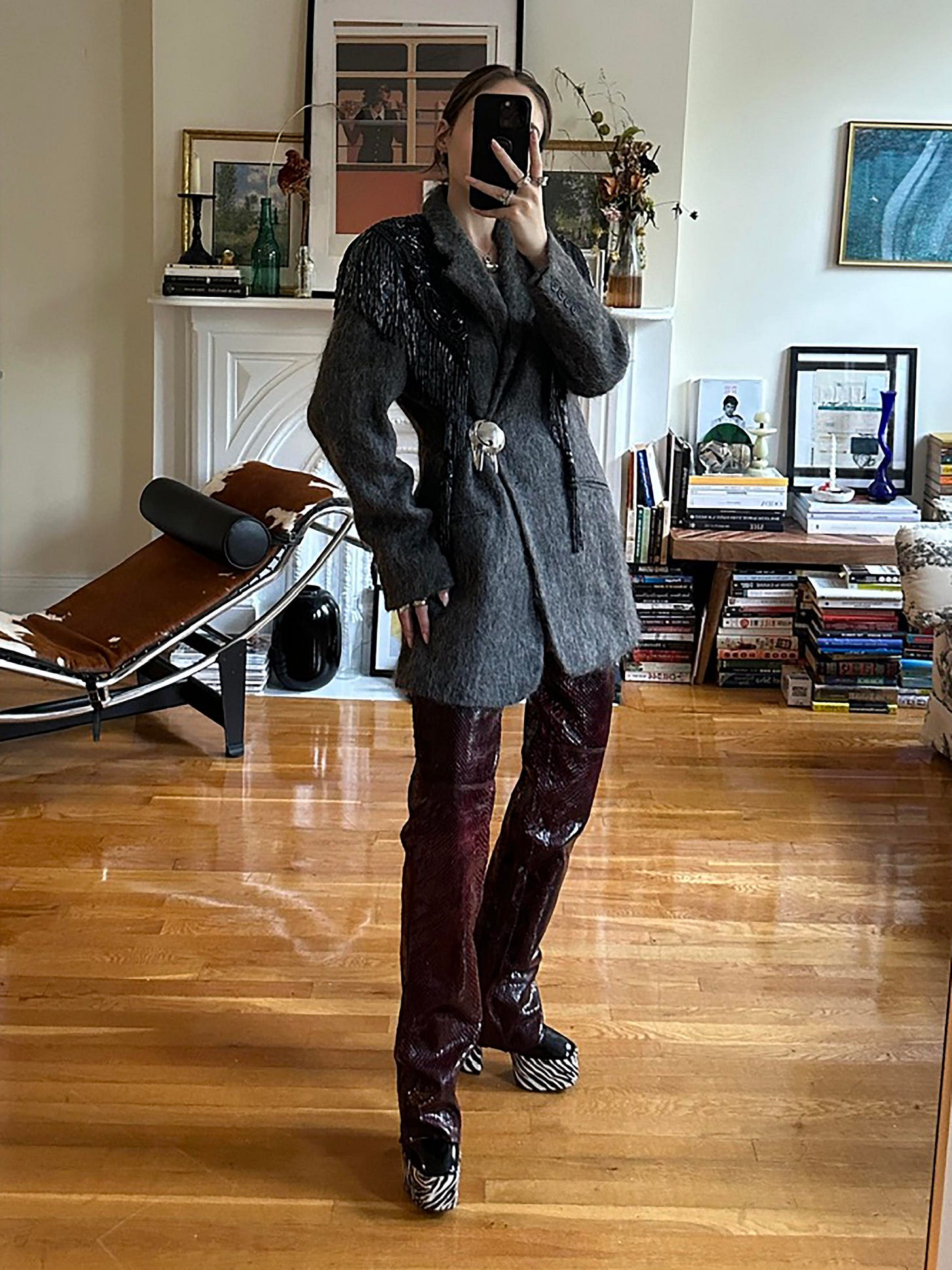 I was going for a vampire Lestat meets grandpa meets 70s dive bar, however, I’m open to criticism on that description. These pants were one of my most anticipated fall purchases - unfortunately, ordering vintage online doesn’t always work out. I double checked the measurements, and yet, upon arrival, they did not fit. They may or may not be clipped to the gods in this photo. (I have many, many clamp clips in my arsenal.) But I still wanted to make a look because they need their moment to shine. (Feel free to message me for these pants, I literally cannot wear them.) Don’t worry, I did find another pair. I’ve posted about them, and I love them. But back to the topic at hand. As we know, oxblood and grey pair well together. And I never wear this blazer. It’s cut slightly too narrow and long for how I like my blazers to fit, but like many of us on Substack, I am leaning into new ways to style jackets. Meaning: brooches. So I pinned my singular silver brooch onto the waist, cinched that baby in, and called it a day. It felt boring still, so I threw on my vintage fringe shawl. A true hero piece if I’ve ever seen one. And to keep the rockstar of it all, I of course had to include a bit of animal and a lot of platform. The Guiseppes have yet to let me down. And that’s about it for this look.